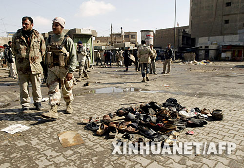 2月1日,在伊拉克首都巴格達(dá)市中心的一處爆炸現(xiàn)場,散落的鞋子被堆放在一起。新華社/法新