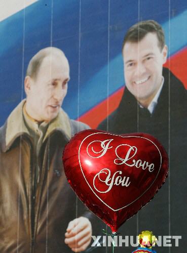 3月1日,在俄羅斯首都莫斯科市中心,一只氣球飛過俄總統(tǒng)候選人梅德韋杰夫的競(jìng)選宣傳畫。3月2日,俄羅斯將舉行總統(tǒng)選舉投票。 新華社記者沈伯韓攝