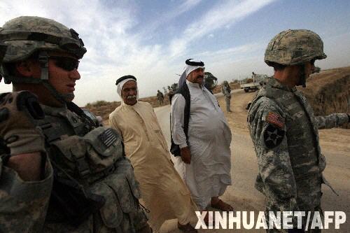 3月10日,在伊拉克迪亞拉省一個村莊的郊外,當(dāng)?shù)夭柯涫最I(lǐng)和美軍士兵查看一處路上埋有簡易爆炸裝置的地點(diǎn)。駐伊拉克美軍當(dāng)日宣布,5名美軍士兵當(dāng)天在巴格達(dá)遭遇炸彈襲擊身亡。 新華社/法新