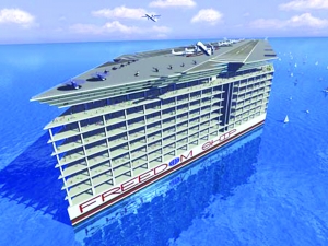 美國“自由之船國際公司”正打算建造一座史無前例的“世界最大的超級(jí)郵輪”——“自由之船”。它1400米長、37層樓高,個(gè)頭相當(dāng)于目前全球最大郵輪“瑪麗女王二世”號(hào)的4倍。船上有多達(dá)1.8萬套“海景房”、劇院、賭場、商業(yè)中心,甚至還有機(jī)場、學(xué)校和醫(yī)院,可供6萬人同時(shí)居住。事實(shí)上,“自由之船”的外形已不像任何一艘現(xiàn)有的巨型郵輪,倒更像是科幻小說中漂浮在海面上的“機(jī)器島”——億萬富豪們可以常年“定居”在這座“海上城市”上,環(huán)繞世界各地海洋漂流!據(jù)設(shè)計(jì)師稱,“自由之船”總造價(jià)估計(jì)高達(dá)110億美元,有望在3年內(nèi)完工。 |