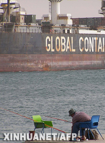 3月25日,在埃及伊斯梅利亞港口附近,一名埃及人在蘇伊士運(yùn)河中航行的美軍“全球愛國者”號旁釣魚。