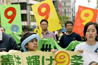 5月3日在日本憲法紀(jì)念日,民眾在東京舉行大游行,手持標(biāo)語主張維護(hù)和平憲法第九條規(guī)定。