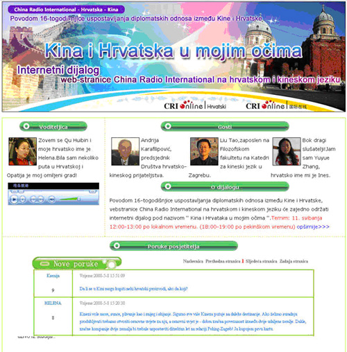 國際在線消息:國際在線中文網(wǎng)和克羅地亞語網(wǎng)將于北京時(shí)間5月11日18:00至19:00聯(lián)合推出主題為“相距不再遙遠(yuǎn)——我眼中的中國和克羅地亞”網(wǎng)絡(luò)對話,這是國內(nèi)首次在中克兩國間采用網(wǎng)絡(luò)方式進(jìn)行的音頻圖文直播模式的訪談。