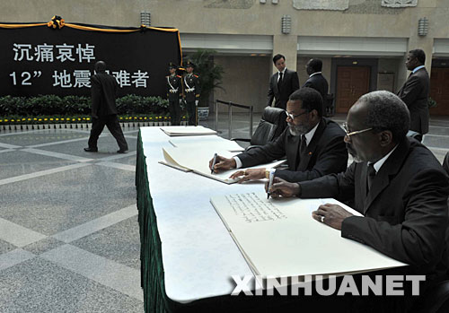 5月19日,外國駐華使節(jié)在吊唁簿上留言。當(dāng)日,外國駐華使節(jié)在外交部吊唁中國四川汶川大地震遇難者。 新華社記者羅曉光攝