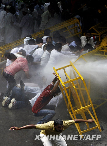 6月1日,在印度首都新德里街頭,警察用水槍驅(qū)散參加抗議的古賈爾人。近期,拉賈斯坦邦古賈爾人要求調(diào)低自己的種姓級別,以便從政府的傾斜政策中獲取更大利益。但政府對此予以拒絕。過去一周,該邦古賈爾人發(fā)動大規(guī)?棺h活動并與警察發(fā)生沖突。5月31日,聲援印度拉賈斯坦邦古賈爾人的活動擴(kuò)大到印度東北部地區(qū)。 新華社/法新