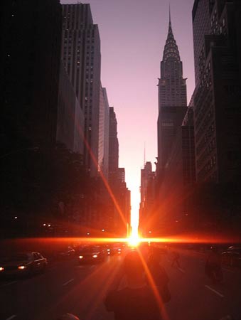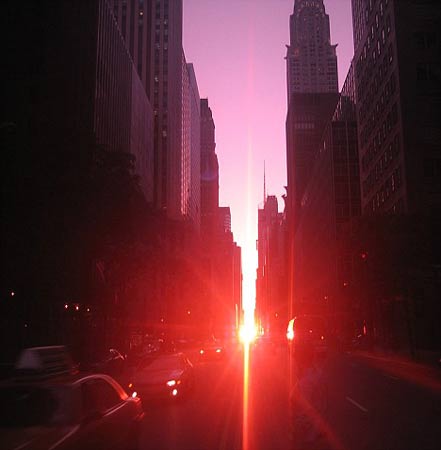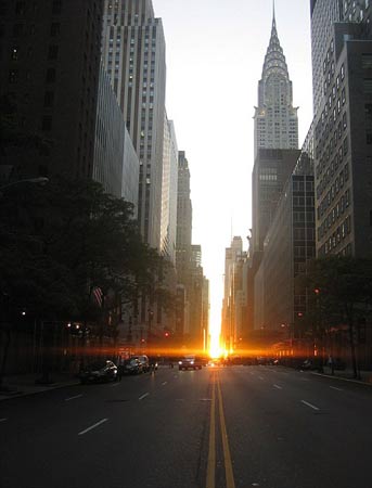 據(jù)報道,該景觀一年僅有兩次,而且還不是年年都有,整個紐約不夜城便沐浴在陽光下。在“曼哈頓懸日”出現(xiàn)的這幾天里,當太陽落下時,在紐約曼哈頓地區(qū)的格網(wǎng)街道的排列形式就如同巨大石柱群布局一樣。