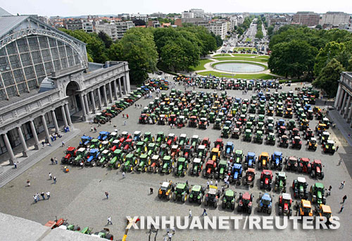 6月18日,比利時(shí)農(nóng)民將數(shù)百輛拖拉機(jī)停在首都布魯塞爾市中心進(jìn)行抗議。