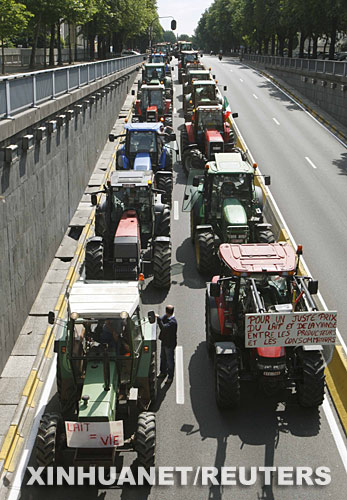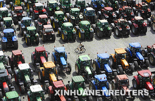 當(dāng)日,比利時(shí)肉制品和奶制品生產(chǎn)者在布魯塞爾市中心抗議高油價(jià)和農(nóng)產(chǎn)品價(jià)格走低。 新華社/路透