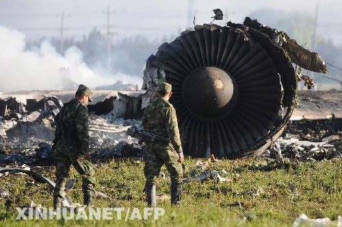 7月7日,在哥倫比亞的莫斯克拉,哥倫比亞空軍人員在查看墜毀的美國(guó)波音747貨機(jī)殘骸。當(dāng)天,這架美國(guó)波音747貨機(jī)從哥倫比亞首都波哥大一機(jī)場(chǎng)起飛后不久撞上一座建筑并起火,造成建筑內(nèi)2人死亡,所幸8名機(jī)組人員全部幸免于難。 新華社/法新