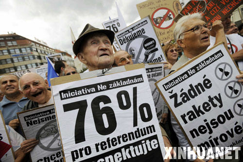 7月8日,數(shù)百名反對(duì)者在捷克首都布拉格市中心舉行抗議活動(dòng),反對(duì)美國(guó)在捷克境內(nèi)建立反導(dǎo)雷達(dá)基地。 新華社/捷通社