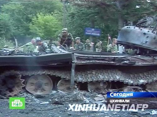 電視畫面顯示的是8月9日,在格魯吉亞南奧塞梯首府茨欣瓦利,一些南奧塞梯自治州武裝人員爬上一輛被毀的格魯吉亞坦克。據(jù)俄塔社報道,格魯吉亞總統(tǒng)薩卡什維利9日說,由于“俄羅斯侵略格魯吉亞”,他決定簽署命令宣布國家進入“戰(zhàn)時狀態(tài)”。圖片來源:新華社/法新
