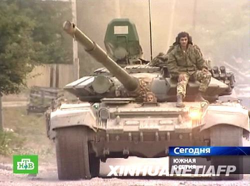 電視畫面顯示的是8月9日,俄羅斯士兵駕駛坦克在格魯吉亞南奧塞梯首府茨欣瓦利附近行進。據(jù)俄塔社報道,格魯吉亞總統(tǒng)薩卡什維利9日說,由于“俄羅斯侵略格魯吉亞”,他決定簽署命令宣布國家進入“戰(zhàn)時狀態(tài)”。圖片來源:新華社/法新