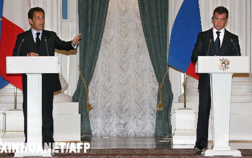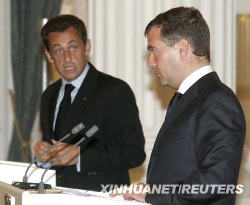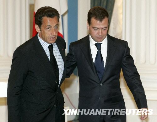 8月12日,俄羅斯總統(tǒng)梅德韋杰夫(右)同法國(guó)總統(tǒng)薩科齊在莫斯科出席聯(lián)合新聞發(fā)布會(huì)。梅德韋杰夫當(dāng)天與到訪的法國(guó)總統(tǒng)薩科齊就解決南奧塞梯沖突達(dá)成包括“放棄使用武力”在內(nèi)的六項(xiàng)原則。梅德韋杰夫說(shuō),兩國(guó)總統(tǒng)支持將六項(xiàng)原則作為解決南奧塞梯沖突的基礎(chǔ)并呼吁各方接受這些原則。 新華社/路透
