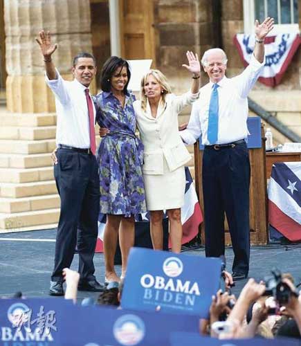 民主黨總統(tǒng)候選人奧巴馬(左)周六在斯普林菲爾德首次跟拜登(右)以競選拍檔身分一起拉票。奧巴馬夫婦跟拜登夫婦向支持者揮手致意。(香港明報(bào)圖)