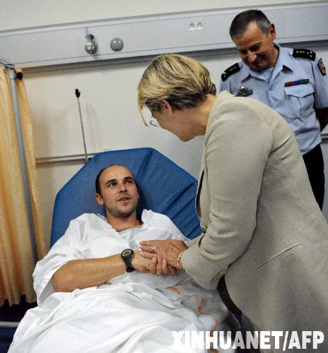 8月24日,法國內(nèi)政部長米謝勒·阿利奧-瑪麗(前右)在薩朗什的一家醫(yī)院看望勃朗峰雪崩中的幸存者。歐洲最高峰勃朗峰在當日凌晨發(fā)生雪崩,目前造成至少8人受傷,10人下落不明。 新華社/法新 |