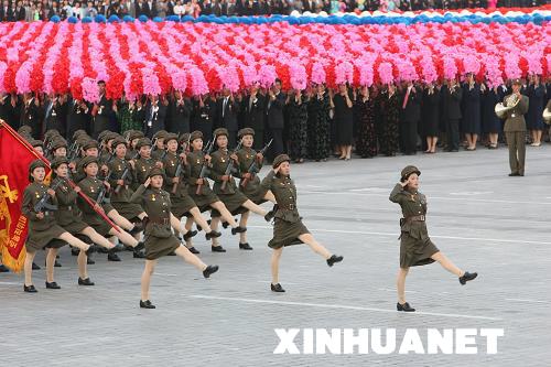 9月9日,閱兵式上的工農(nóng)赤衛(wèi)隊(duì)女兵。朝鮮國(guó)防委員會(huì)、人民武力部和勞動(dòng)黨平壤市委員會(huì)當(dāng)日在平壤金日成廣場(chǎng)舉行工農(nóng)赤衛(wèi)隊(duì)閱兵式,熱烈慶祝朝鮮建國(guó)60周年。新華社記者 張濱陽(yáng) 攝