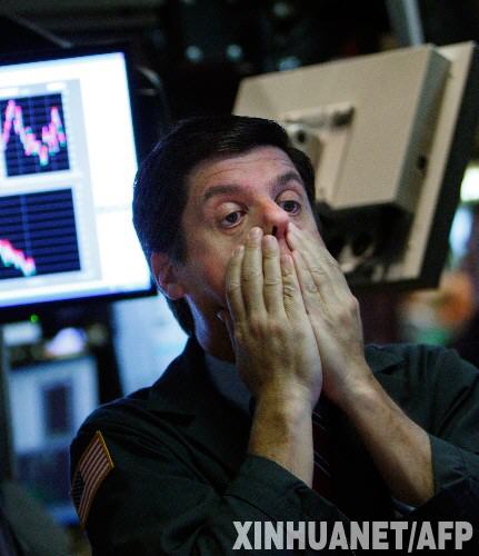 10月7日,一名交易員在美國紐約股票交易所。由于對信貸危機(jī)加深的恐慌導(dǎo)致投資者持續(xù)拋售股票,當(dāng)日紐約股市連續(xù)第五天下挫,標(biāo)準(zhǔn)普爾指數(shù)五年來首次跌破1000點。道瓊斯指數(shù)和標(biāo)普今年已分別下跌了29%和32%,創(chuàng)1937年以來之最。 新華社/法新