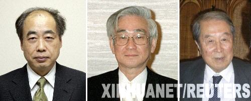 2008年10月7日 日美科學家分享2008年諾貝爾物理學獎 10月7日,瑞典皇家科學院在斯德哥爾摩宣布,美國籍科學家南部陽一郎和日本科學家小林誠、益川敏英獲得2008年諾貝爾物理學獎。這是小林誠(左)、益川敏英(中)和南部陽一郎的拼版照片。 新華社/路透