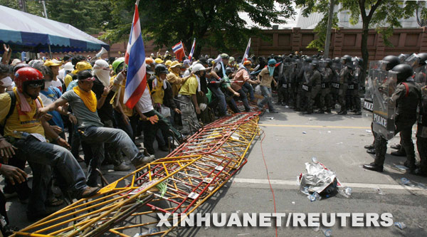 泰國警方7日與聚集在國會(huì)大院外和曼谷警察局前的反政府的人民民主聯(lián)盟(民盟)支持者發(fā)生沖突,警方多次使用催淚彈,而民盟支持者則用棍棒和石塊等還擊。