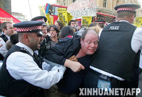 10月10日,在英國首都倫敦,一位參加反對救市示威游行的男子(中)與警察發(fā)生沖突。一些倫敦市民和學(xué)生當(dāng)天在倫敦金融街舉行反對政府救市示威游行活動,并打出“反對資本家”、“我們?yōu)槭裁匆獮樗麄冎圃斓奈C(jī)埋單”等標(biāo)語。當(dāng)日倫敦股市出現(xiàn)大跳水,《金融時報》100種股票平均價格指數(shù)跌幅高為8.85%。 新華社/法新