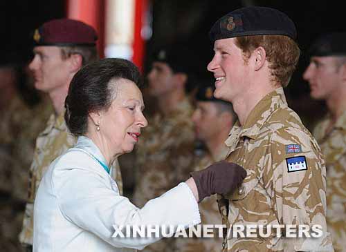 5月5日,英國哈里王子(前右)在溫莎一個(gè)兵營接受安妮公主授予的服役勛章。據(jù)報(bào)道,哈里王子因在阿富汗前線的服役經(jīng)歷獲得一枚勛章。 新華社/路透