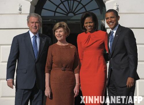 11月10日,美國(guó)當(dāng)選總統(tǒng)奧巴馬(右一)及其夫人米歇爾(右二)與美國(guó)現(xiàn)任總統(tǒng)布什(左一)及其夫人勞拉在美國(guó)白宮合影。奧巴馬當(dāng)日應(yīng)邀首次進(jìn)入白宮橢圓形辦公室會(huì)見布什,就經(jīng)濟(jì)危機(jī)和伊拉克戰(zhàn)爭(zhēng)等問題舉行會(huì)談,以確保政府順利過渡。 新華社/法新