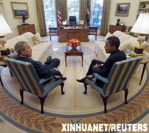 11月10日,美國(guó)當(dāng)選總統(tǒng)奧巴馬(右)應(yīng)邀首次進(jìn)入白宮橢圓形辦公室會(huì)見現(xiàn)任總統(tǒng)布什,就經(jīng)濟(jì)危機(jī)和伊拉克戰(zhàn)爭(zhēng)等問題舉行會(huì)談,以確保政府順利過渡。 新華社/路透
