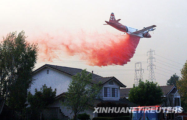 11月16日,在美國加利福尼亞州鉆石崗,一架飛機噴灑防火劑。新華社/路透