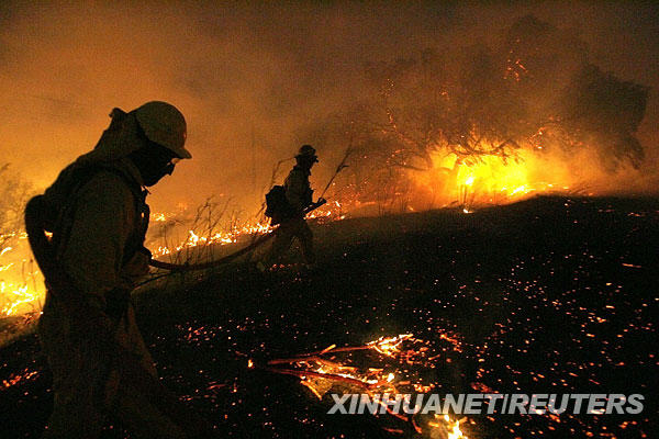 11月16日,在美國加利福尼亞州布雷亞,消防員試圖控制火勢。連日來,美國加州南部山林大火席卷洛杉磯及鄰近地區(qū),燒毀800多處住宅,數(shù)萬人被迫疏散。 新華社/路透