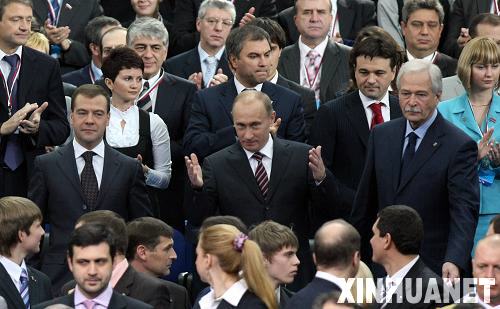 11月20日,俄羅斯總統(tǒng)梅德韋杰夫(中左)、俄總理普京(中)與俄國家杜馬(議會下院)主席格雷茲洛夫(中右)共同步入會場。當日,統(tǒng)一俄羅斯黨在莫斯科召開第十次代表大會。新華社記者沈伯韓攝