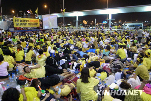 民盟支持者25日在素萬那普國際機(jī)場舉行大規(guī)模反政府集會,要求頌猜政府下臺。當(dāng)晚,民盟成員強(qiáng)行進(jìn)入機(jī)場候機(jī)樓,使機(jī)場運(yùn)行陷入癱瘓。出于安全考慮,泰國機(jī)場管理局當(dāng)晚下令關(guān)閉素萬那普國際機(jī)場。