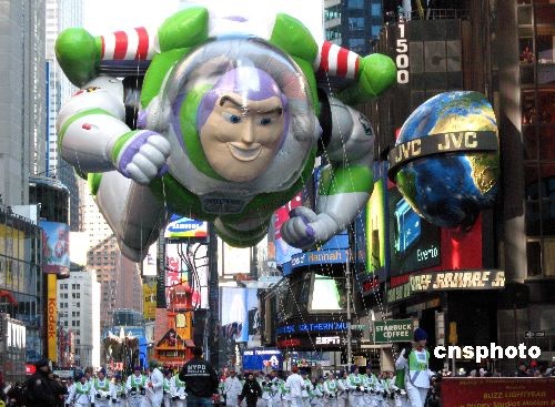 美國紐約第八十二屆感恩節(jié)大游行于11月27日在曼哈頓百老匯大道舉行,預計有300萬當?shù)鼐用窈陀^光客沿街觀看。圖為首次登場感恩節(jié)游行的動畫片《玩具總動員》中的卡通人物熱氣球走過時代廣場。 中新社發(fā) 鄧悅 攝