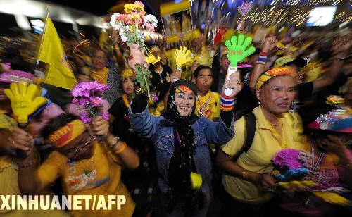 12月2日,泰國反政府的人民民主聯(lián)盟(民盟)示威者在曼谷素萬那普國際機(jī)場歡呼。在泰國憲法法院2日下午判決解散執(zhí)政聯(lián)盟中的三黨人民力量黨、泰國黨和中庸民主黨之后,民盟領(lǐng)導(dǎo)人舉行會(huì)議,就民盟今后的行動(dòng)進(jìn)行了磋商。會(huì)議結(jié)束后,民盟領(lǐng)導(dǎo)人頌提等舉行記者招待會(huì),宣布當(dāng)?shù)貢r(shí)間3日上午10時(shí)同時(shí)結(jié)束在總理府、曼谷素萬那普國際機(jī)場和廊曼機(jī)場的集會(huì)示威活動(dòng)。 新華社/法新