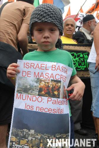 2009年1月7日 阿根廷舉行抗議活動反對以軍入侵加沙 1月6日,一名兒童舉著反戰(zhàn)標語參加在阿根廷首都布宜諾斯艾利斯舉行的反戰(zhàn)游行。阿根廷的阿拉伯移民及當?shù)孛癖娫诓家酥Z斯艾利斯市中心舉行示威游行,反對以色列軍隊入侵加沙。 新華社/美洲通訊社
