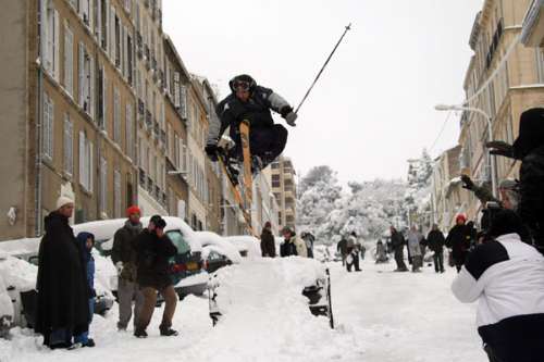 法國(guó)第二大城市馬賽7日降大雪,市民在城內(nèi)練習(xí)滑雪。