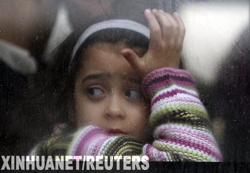 1月8日,一名準備離開加沙地帶以躲避戰(zhàn)火的巴勒斯坦兒童從大巴中向外張望。 新華社/路透