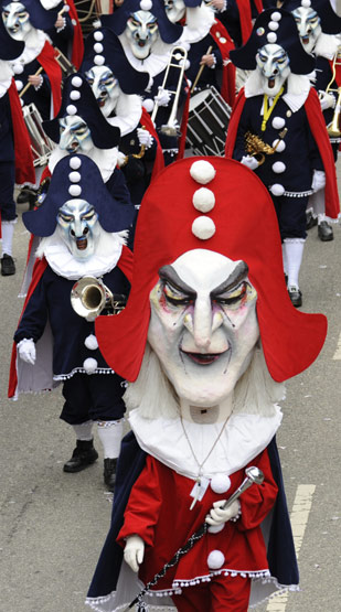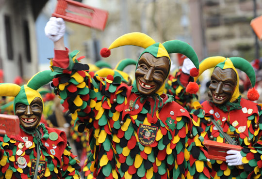 2月1日,德國南部城市弗萊堡舉行第75屆嘉年華會,狂歡者身著盛裝,帶著怪異的面具在街道上游行。