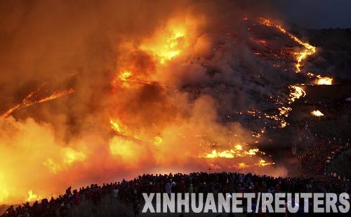 2月9日,在韓國昌寧郡,正月十五傳統(tǒng)的“燒蒲葦”活動引發(fā)火災(zāi)。新華社/路透