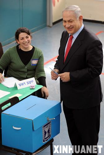 2月10日,以色列議會最大反對黨利庫德集團主席內(nèi)塔尼亞胡(右)在耶路撒冷的一個投票站投票。新華社記者殷博古攝
