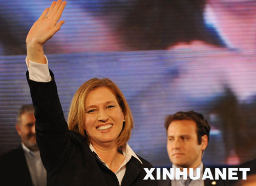 圖為以色列外長、前進黨主席利夫尼在特拉維夫的慶祝集會上向支持者揮手致意(2月11日攝)。新華社記者殷博古攝