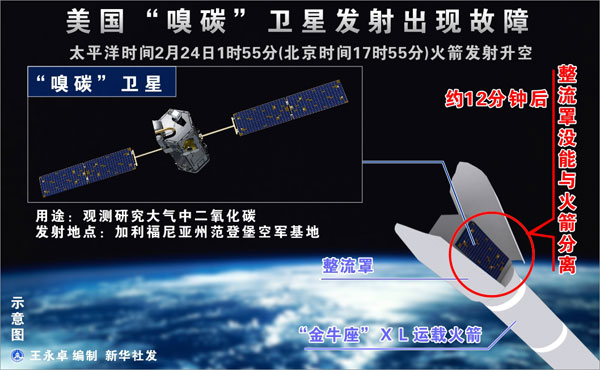 圖表:美國(guó)“嗅碳”衛(wèi)星發(fā)射出現(xiàn)故障 新華社發(fā)