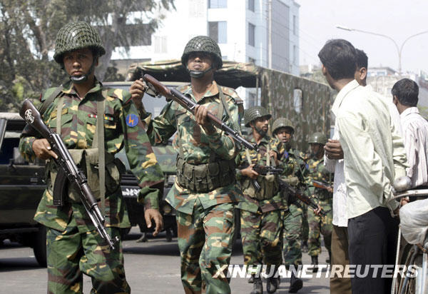 2月25日,在孟加拉國首都達卡,士兵在“孟加拉國步槍隊”總部附近警戒。新華社/路透