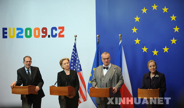 3月5日,在比利時(shí)首都布魯塞爾的歐盟總部,歐盟負(fù)責(zé)外交與安全事務(wù)的高級(jí)代表索拉納、到訪的美國國務(wù)卿希拉里·克林頓、歐盟輪值主席國捷克外長施瓦岑貝格和歐盟委員會(huì)負(fù)責(zé)對(duì)外關(guān)系和歐洲睦鄰政策的委員瓦爾德納(從左至右)共同會(huì)見記者。美國國務(wù)卿希拉里·克林頓當(dāng)天到訪歐盟,并將于當(dāng)晚在瑞士日內(nèi)瓦與俄羅斯外長拉夫羅夫舉行會(huì)談。新華社記者武巍攝
