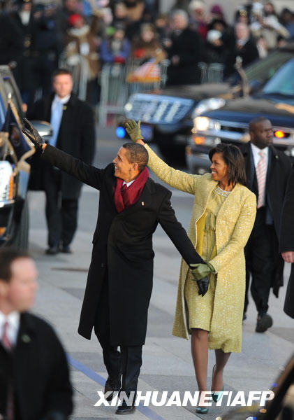 1月20日,在美國(guó)首都華盛頓,美國(guó)新任總統(tǒng)奧巴馬和其夫人米歇爾在總統(tǒng)就職慶祝游行中向民眾揮手致意。新華社/法新
