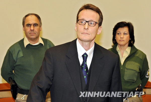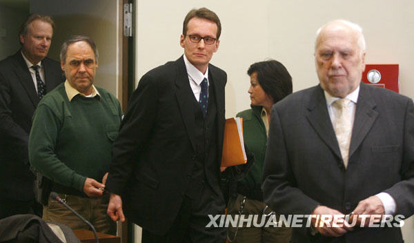 3月9日,瑞士男子黑爾格·斯加爾比(中)在律師的陪同下來到德國慕尼黑的法庭接受審判。新華社/路透