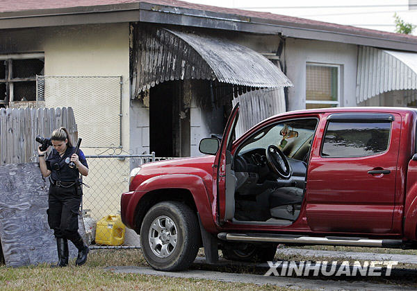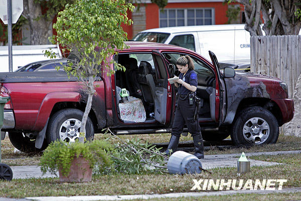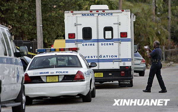 3月15日,在美國邁阿密,一名警察在槍擊案嫌犯自殺現(xiàn)場工作。新華社/美聯(lián)