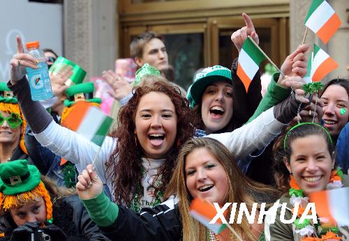 3月17日,在美國(guó)紐約曼哈頓,觀眾興奮地和圣帕特里克節(jié)游行隊(duì)伍打招呼。當(dāng)日,紐約舉行盛大游行,慶祝圣帕特里克節(jié)。圣帕特里克節(jié)是愛爾蘭人紀(jì)念愛爾蘭守護(hù)神圣帕特里克的節(jié)日,至今已有1500多年歷史,這一節(jié)慶傳統(tǒng)被愛爾蘭移民帶入美國(guó)。新華社記者 申宏 攝