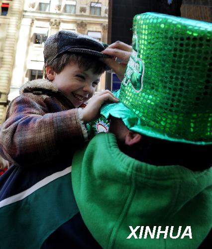 3月17日,在美國(guó)紐約曼哈頓,一名男孩為父親戴上喜慶的綠色帽子。當(dāng)日,紐約舉行盛大游行活動(dòng)慶祝圣帕特里克節(jié)。圣帕特里克節(jié)是愛爾蘭人紀(jì)念愛爾蘭守護(hù)神圣帕特里克的節(jié)日,至今已有1500多年歷史,這一節(jié)慶傳統(tǒng)被愛爾蘭移民帶入美國(guó)。新華社記者 谷欣容攝