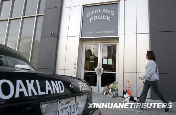 3月21日,在美國(guó)加利福尼亞州的奧克蘭市,一名婦女從警察局門(mén)前經(jīng)過(guò),警察局門(mén)口擺放著悼念殉職警察的鮮花。新華社/路透