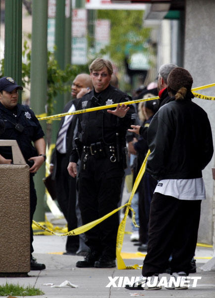 3月21日,在美國(guó)加利福尼亞州的奧克蘭市,當(dāng)?shù)鼐煸跇寭衄F(xiàn)場(chǎng)詢(xún)問(wèn)目擊者。新華社/美聯(lián)